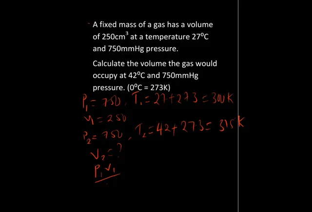 A Fixed Mass Of A Gas Has A Volume Of 250cm Sup 3 Sup At A Temperature 27 C And 750mmhg Pressure Calculate The Volume The Gas Would Occupy At 42 C And 750mmhg Pressure 0 C